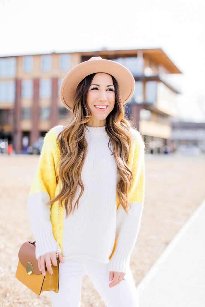 This outfit is giving me all the spring vibes! Yellow and white makes me think of Easter! Out of all the sweaters I’m showing you this one is the heaviest but the light colors make it great for now through spring.